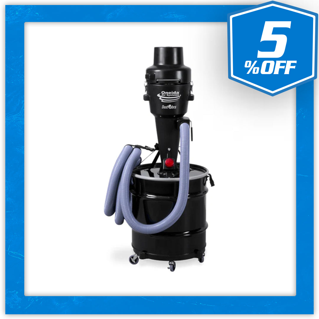 Oneida Air Systems' Dust Cobra® is the system of choice for both hobbyist and professional craftsman looking for a powerful, compact, and versatile dust control system. Its patented cyclonic design provides 3x higher airflow performance when compared to traditional vacuums and works to minimize downtime by virtually eliminating filter clogging and suction loss.